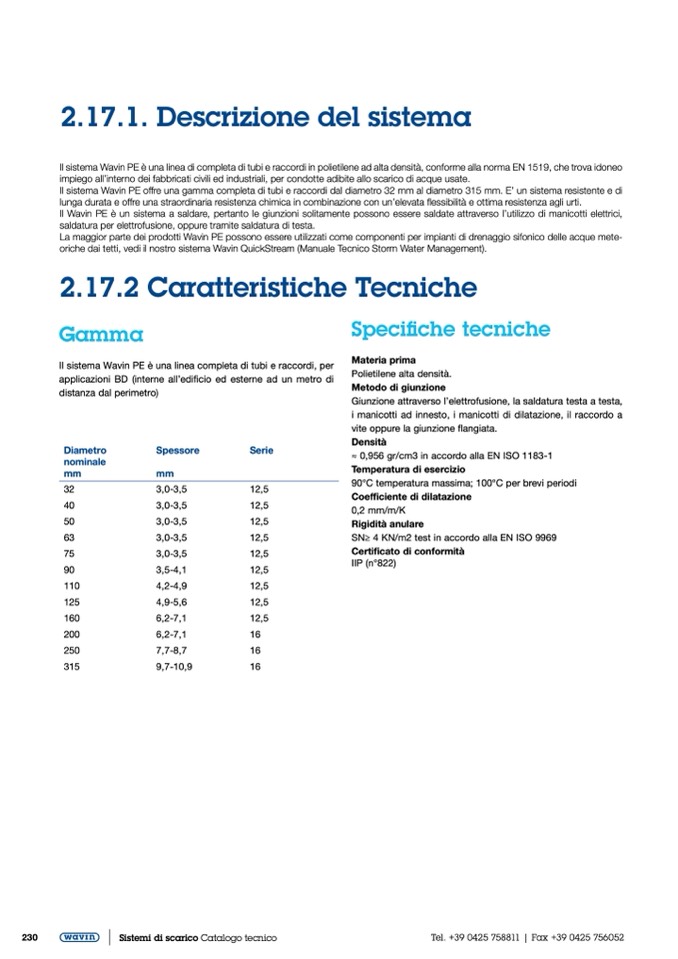 Il sistema Wavin PE è una linea di completa di tubi e raccordi in polietilene ad alta densità, conforme alla norma EN 1519, che trova idoneo