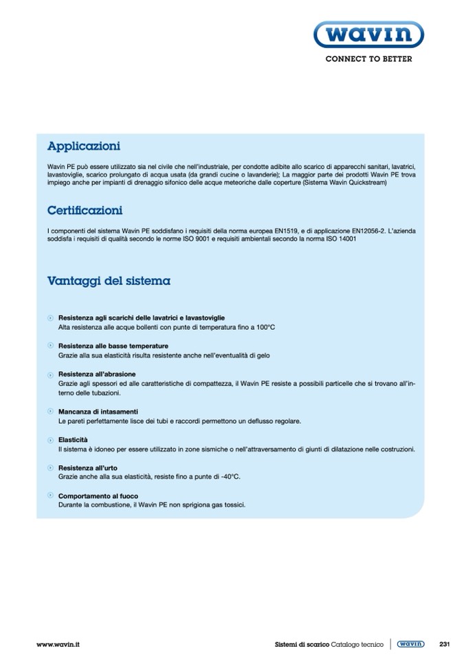I componenti del sistema Wavin PE soddisfano i requisiti della norma europea EN1519, e di applicazione EN12056-2. L’azienda