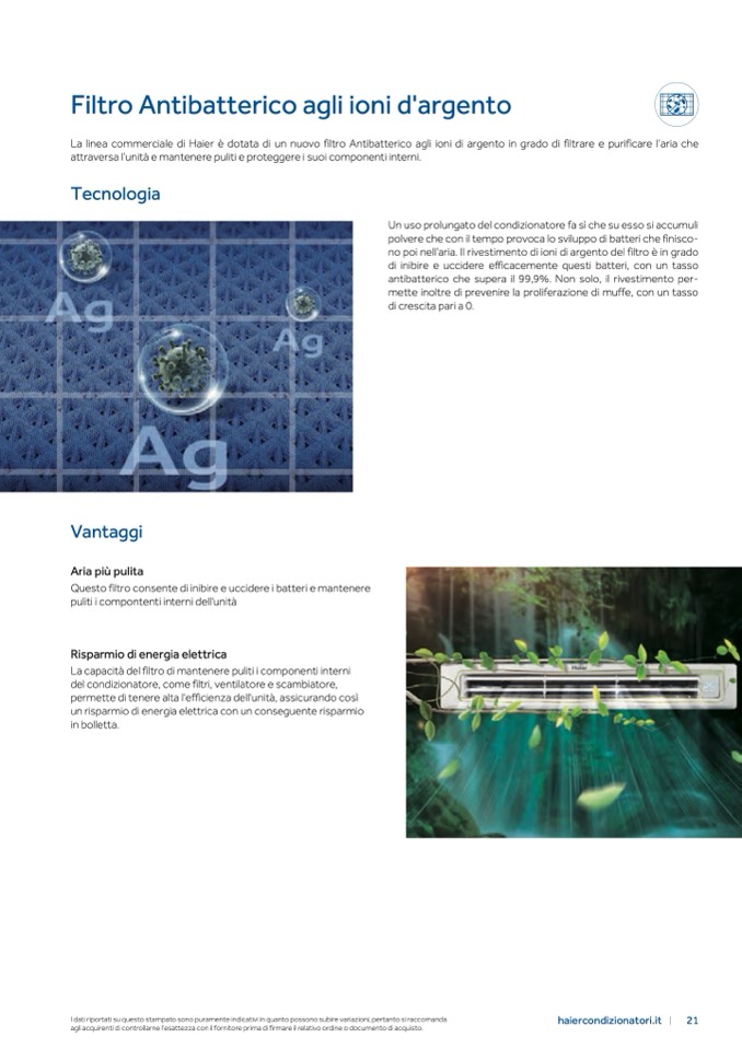 La linea commerciale di Haier è dotata di un nuovo filtro Antibatterico agli ioni di argento in grado di filtrare e purificare l’aria che