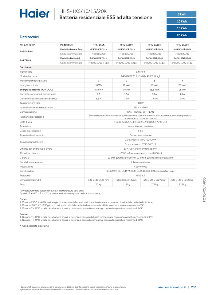 IEC62619, CE, UL1973, FCC, UL9540, CEI-021 con inverter Haier