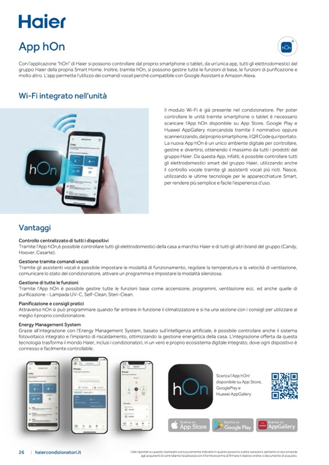 gruppo Haier della propria Smart Home. Inoltre, tramite hOn, si possono gestire tutte le funzioni di base, le funzioni di purificazione e