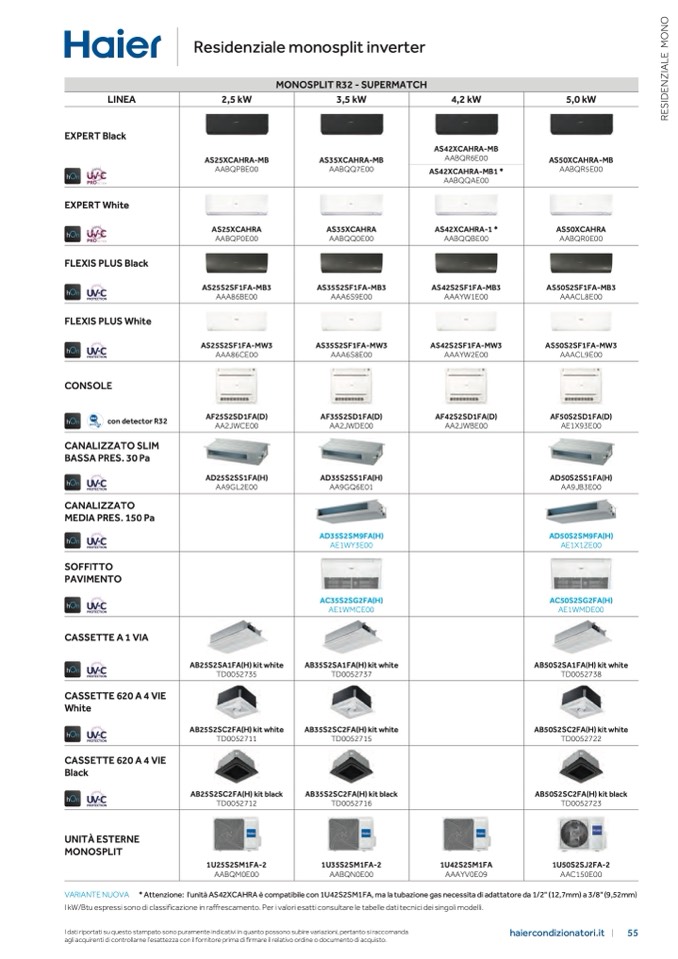 I kW/Btu espressi sono di classificazione in raffrescamento. Per i valori esatti consultare le tabelle dati tecnici dei singoli modelli.