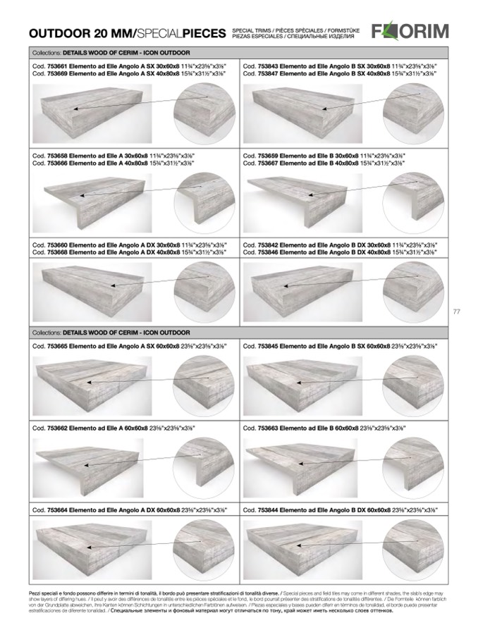 Pezzi speciali e fondo possono differire in termini di tonalità, il bordo può presentare stratificazioni di tonalità diverse. / Special pieces and field tiles may come in different shades, the slab’s edge may