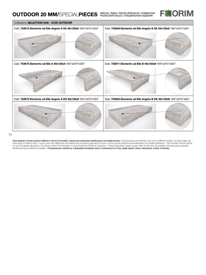 Pezzi speciali e fondo possono differire in termini di tonalità, il bordo può presentare stratificazioni di tonalità diverse. / Special pieces and field tiles may come in different shades, the slab’s edge may