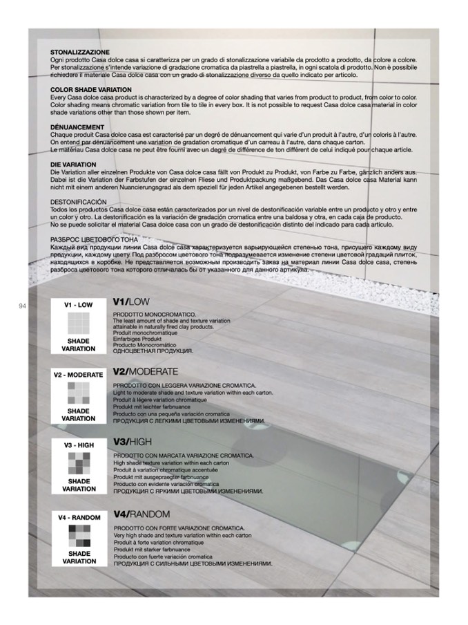 Color shading means chromatic variation from tile to tile in every box. It is not possible to request Casa dolce casa material in color