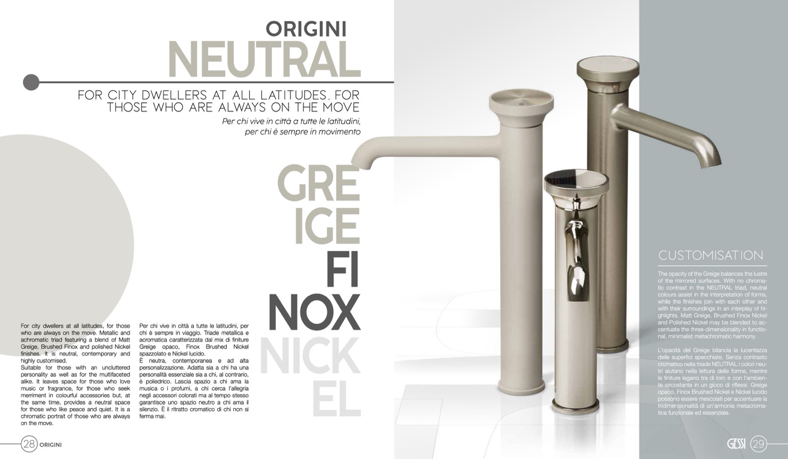 Greige, Brushed Finox and polished Nickel