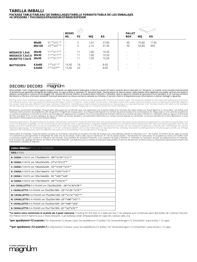 stirolo per garantire l’integrità dei singoli pezzi. Su ogni scatola e’ riportato: N° dei pezzi totali - Numerazione di ciascun pezzo. Sulla paletta viene applicata una pallet card ed una busta i