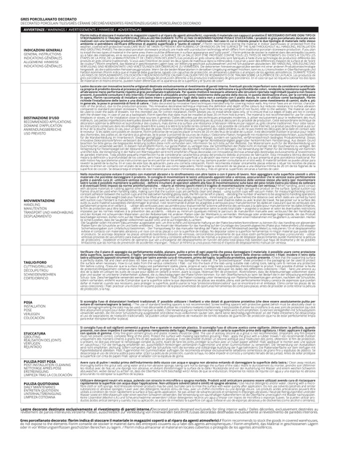 erale, la posa in prossimità di fonti di calore. / Slabs decorated by innovative hand techniques intended only for covering indoor walls. Any minor flaws are an intrinsic characte