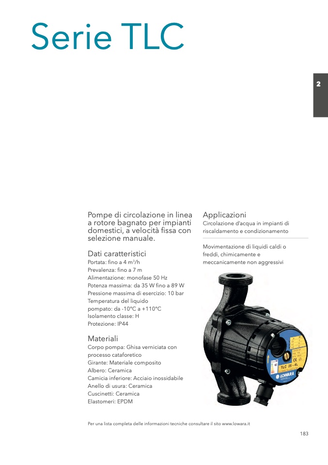 Per una lista completa delle informazioni tecniche consultare il sito www.lowara.it