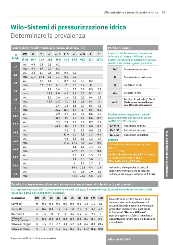 Dati espressi in mca per 100 m di tubazione, la velocità dell’acqua è espressa in m/s. (La tabella è valida per una velocità del
