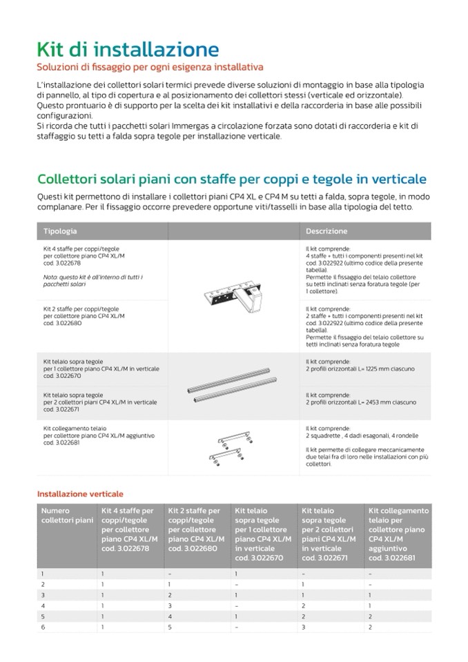 Si ricorda che tutti i pacchetti solari Immergas a circolazione forzata sono dotati di raccorderia e kit di