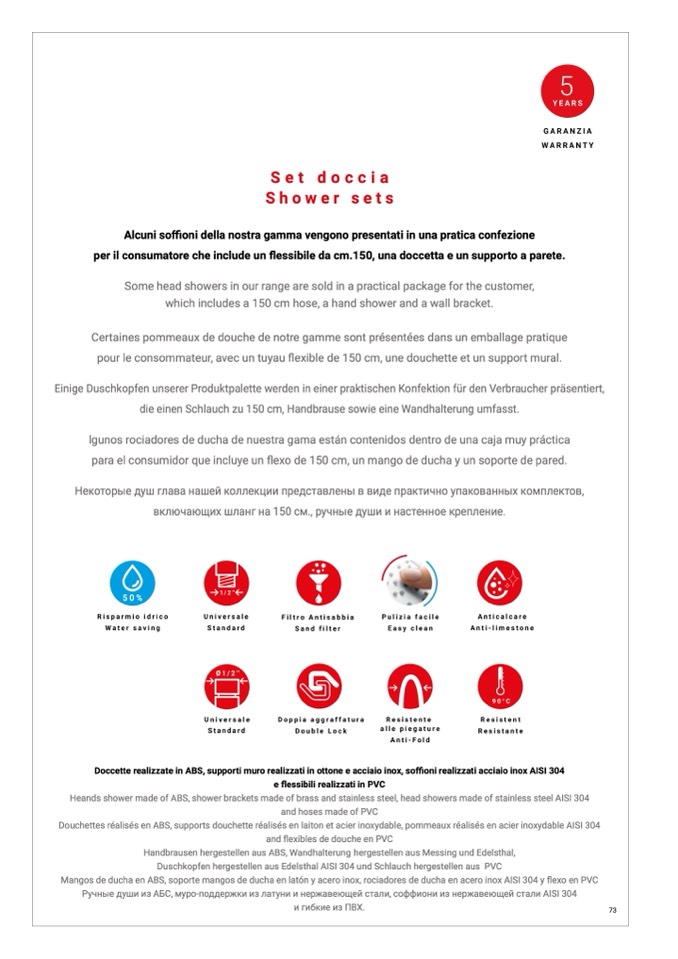 Douchettes réalisés en ABS, supports douchette réalisés en laiton et acier inoxydable, pommeaux réalisés en acier inoxydable AISI 304