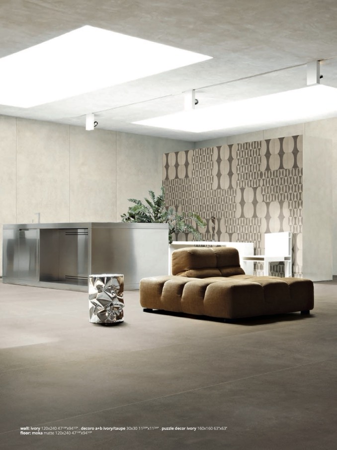 wall: ivory 120x240 471/4”x941/2” . decoro a+b ivory/taupe 30x30 113/4”x113/4” . puzzle decor ivory 160x160 63”x63