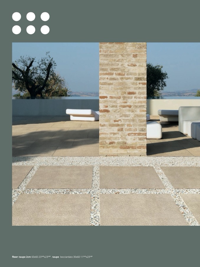 floor: taupe 2cm 60x60 235/8”x235/8” . taupe bocciardato 30x60 113/4”x235/8”