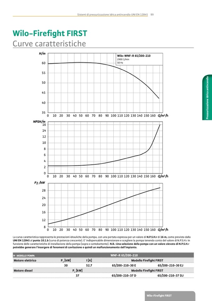 UNI EN 12845 al punto 10.1.b (curva di potenza crescente). E’ indispensabile dimensionare e scegliere la pompa tenendo conto del valore di N.P.S.H.r in