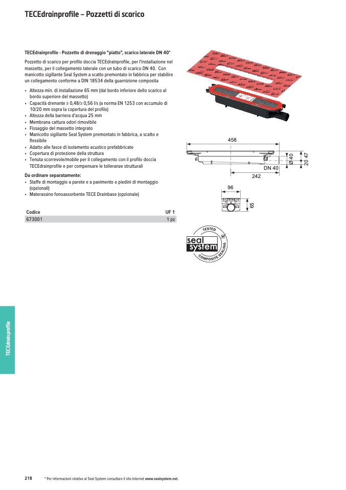 TECEdrainprofile - Pozzetto di drenaggio "piatto", scarico laterale DN 40*