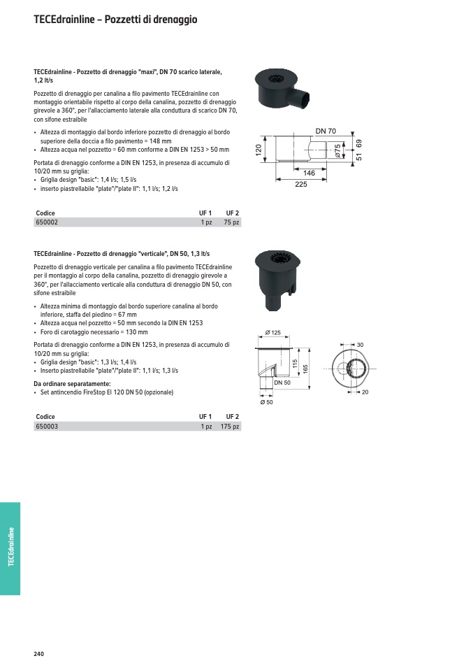 TECEdrainline - Pozzetto di drenaggio "verticale", DN 50, 1,3 lt/s