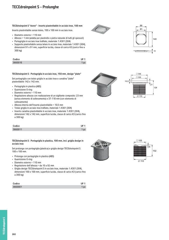 • Supporto piastrellabile senza telaio in acciaio inox, materiale 1.4301 (304),
