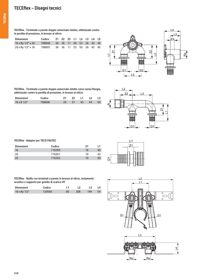 TECEflex - Staffa con terminali a parete in bronzo al silicio, isolamento