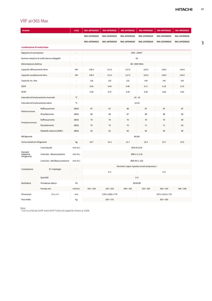 * Con le unità da 0.4HP and 0.6HP l’indice di capacità rimane al 150%