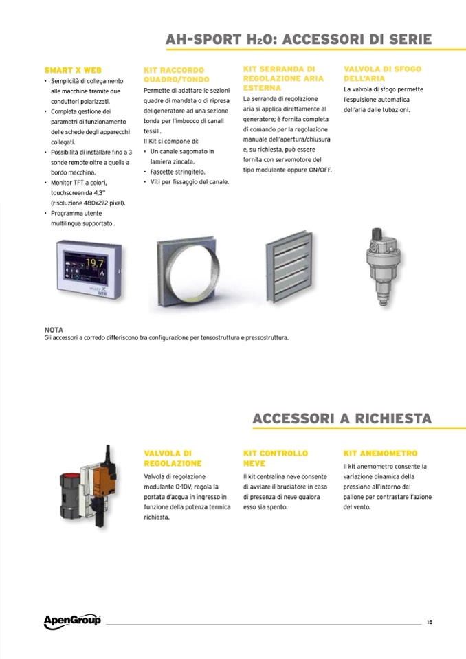 Gli accessori a corredo differiscono tra configurazione per tensostruttura e pressostruttura.