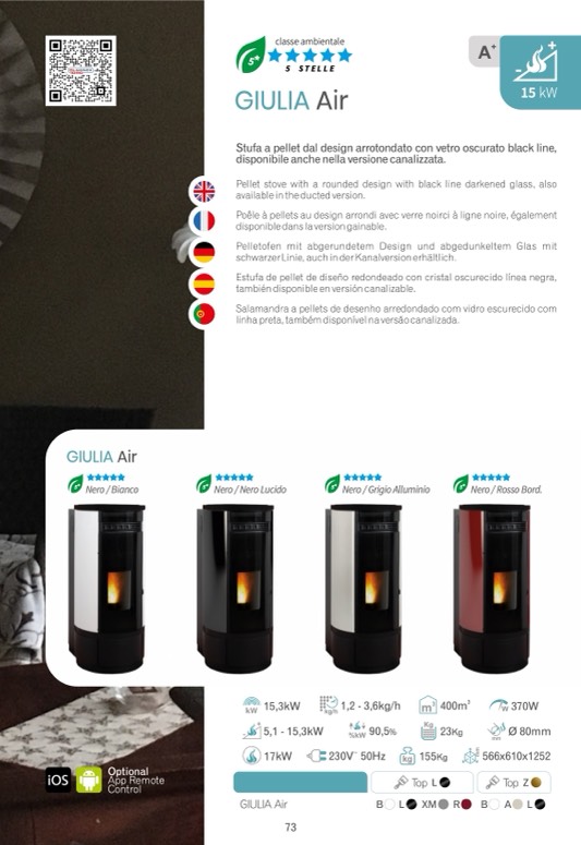 Stufa a pellet dal design arrotondato con vetro oscurato black line,