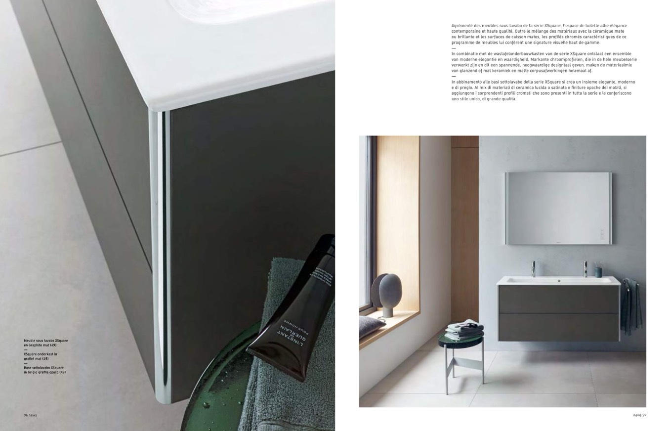 Agrémenté des meubles sous lavabo de la série XSquare, l’espace de toilette allie élégance