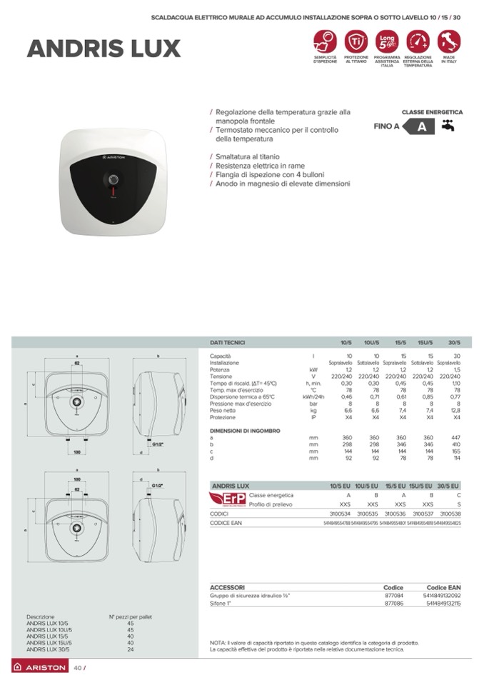 SCALDACQUA ELETTRICO MURALE AD ACCUMULO INSTALLAZIONE SOPRA O SOTTO LAVELLO 10 / 15 / 30