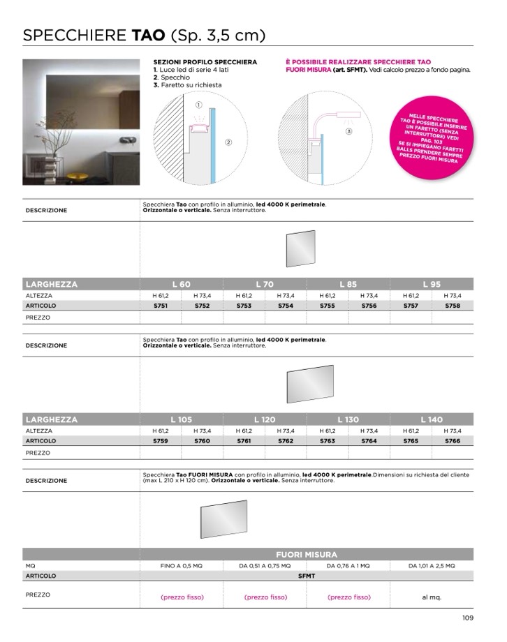 Specchiera Tao FUORI MISURA con profilo in alluminio, led 4000 K perimetrale.Dimensioni su richiesta del cliente