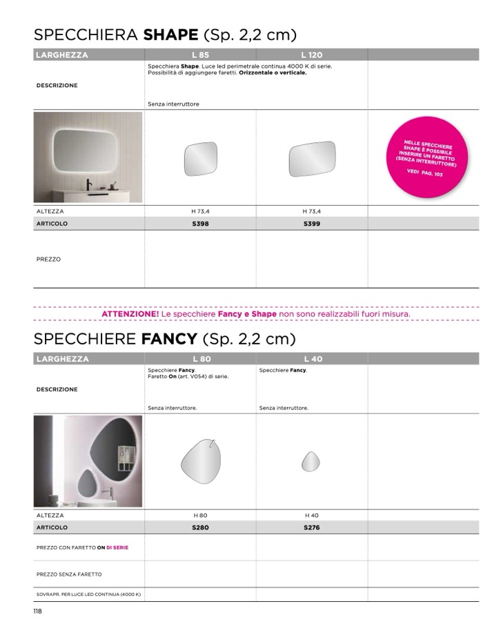 Specchiera Shape. Luce led perimetrale continua 4000 K di serie.