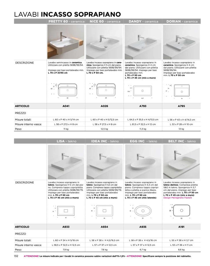 ATTENZIONE! Le misure indicate per i lavabi in ceramica possono subire variazioni dell’1%-1,5% - ATTENZIONE! Specificare sempre la posizione del rubinetto.