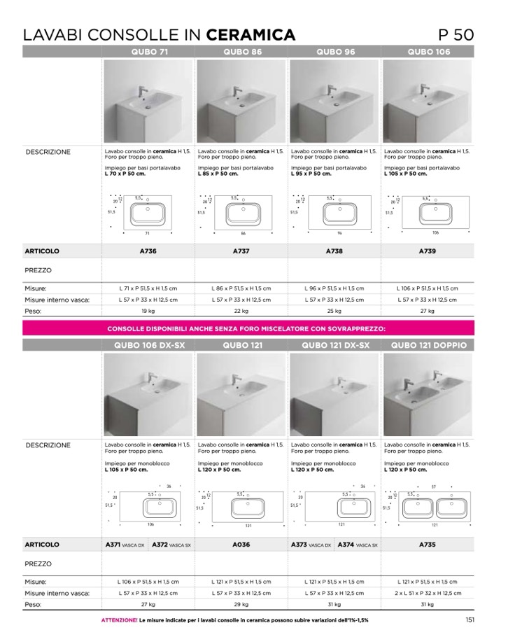 ATTENZIONE! Le misure indicate per i lavabi consolle in ceramica possono subire variazioni dell’1%-1,5%