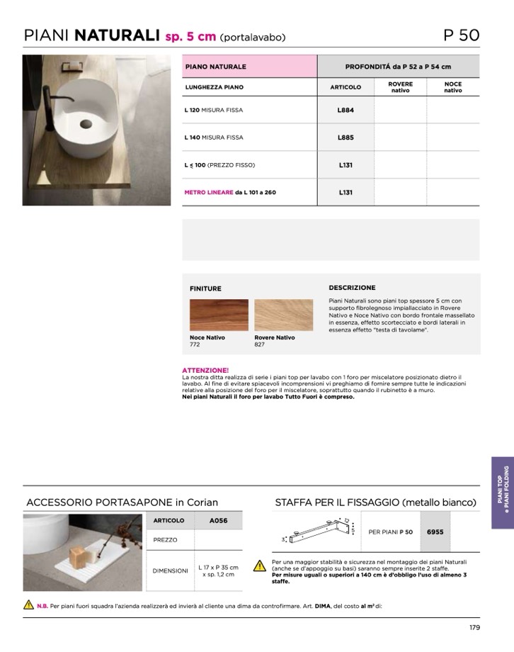 Nei piani Naturali il foro per lavabo Tutto Fuori è compreso.