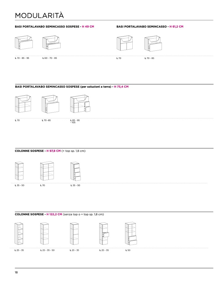 BASI PORTALAVABO SEMINCASSO SOSPESE (per soluzioni a terra) - H 73,4 CM
