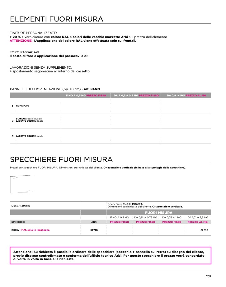 previo disegno controfirmato e conferma dell'ufficio tecnico Arbi. Per queste specchiere il prezzo verrà concordato