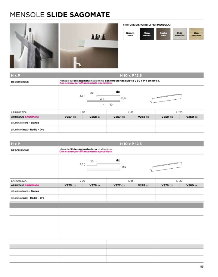 Mensole Slide sagomata in alluminio con foro portasalviette L 30 x P 4 cm dx-sx.