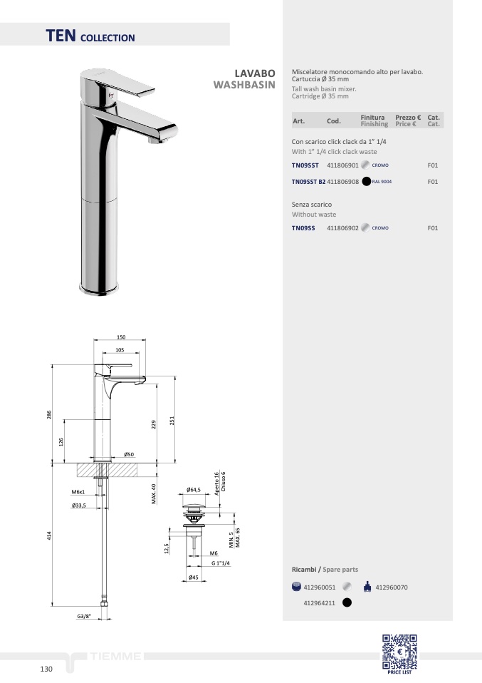 Miscelatore monocomando alto per lavabo.