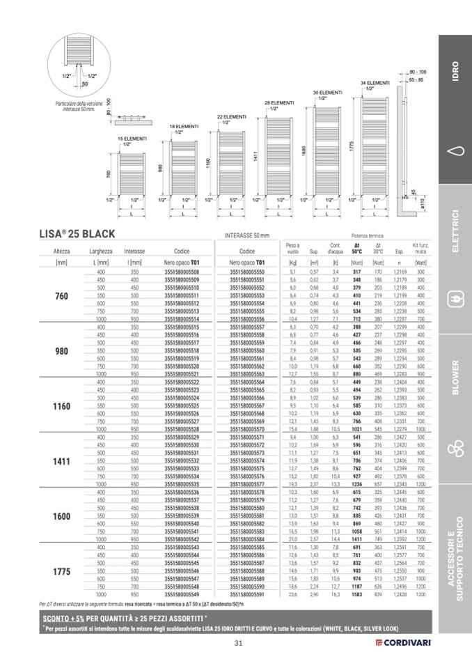 Per pezzi assortiti si intendono tutte le misure degli scaldasalviette LISA 25 IDRO DRITTI E CURVO e tutte le colorazioni (WHITE, BLACK, SILVER LOOK)