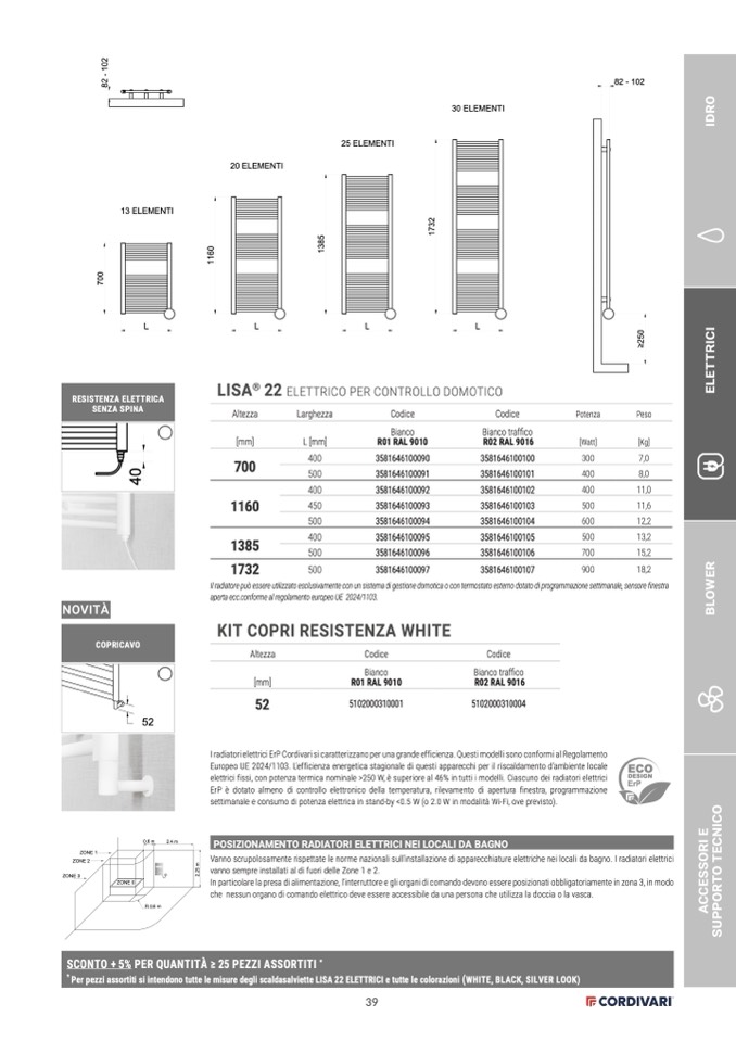 Per pezzi assortiti si intendono tutte le misure degli scaldasalviette LISA 22 ELETTRICI e tutte le colorazioni (WHITE, BLACK, SILVER LOOK)