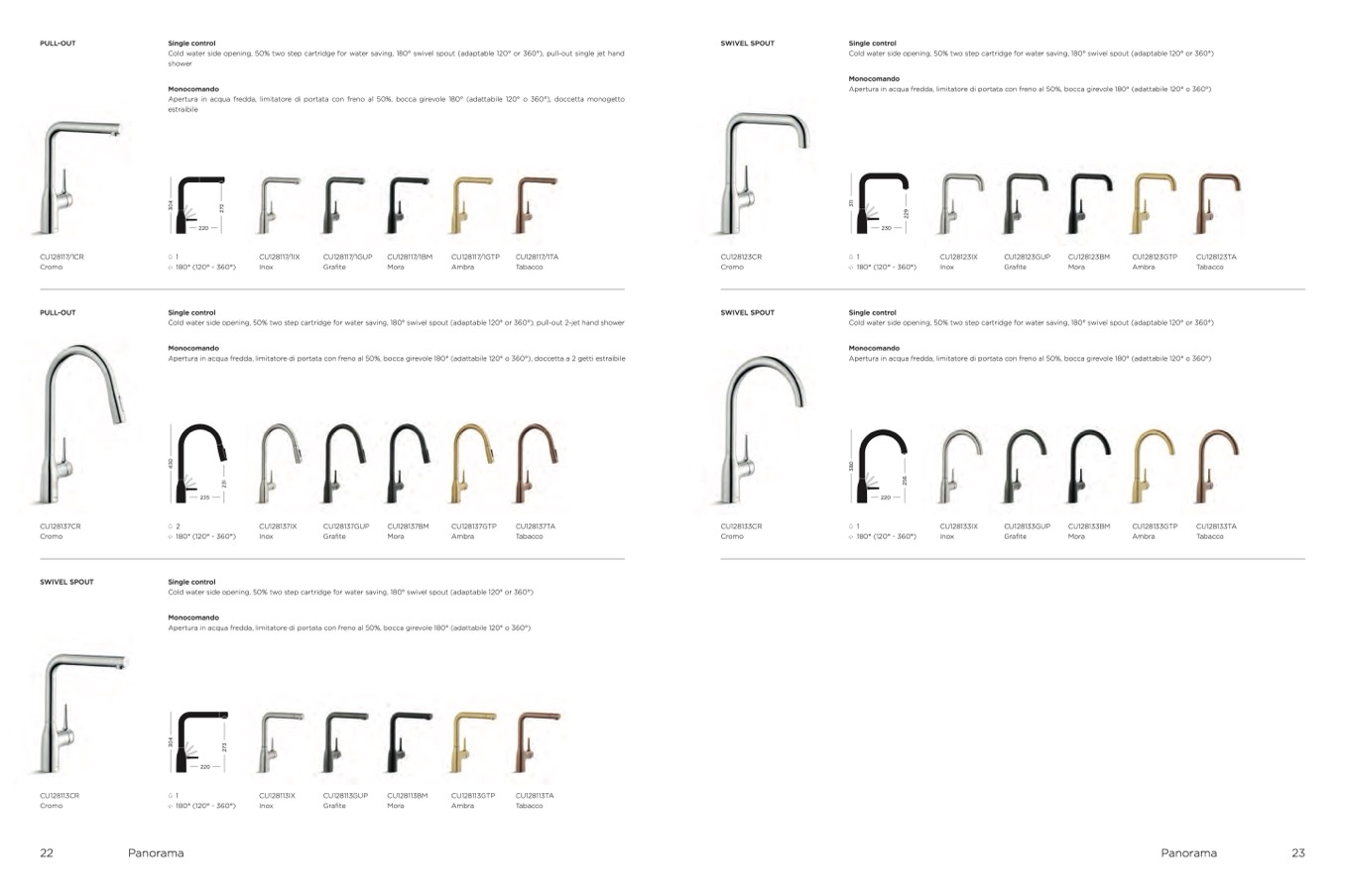 Cold water side opening, 50% two step cartridge for water saving, 180° swivel spout (adaptable 120° or 360°)