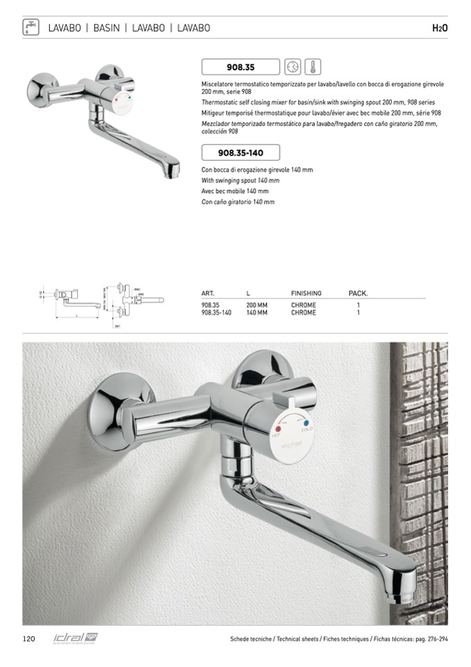 Thermostatic self closing mixer for basin/sink with swinging spout 200 mm, 908 series