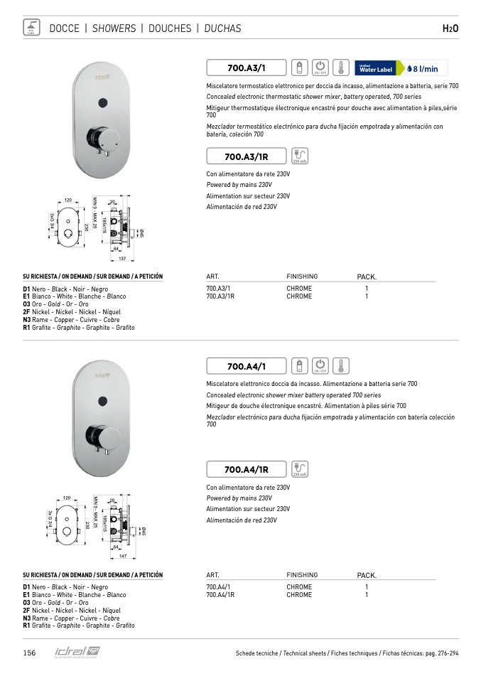 Miscelatore termostatico elettronico per doccia da incasso, alimentazione a batteria, serie 700