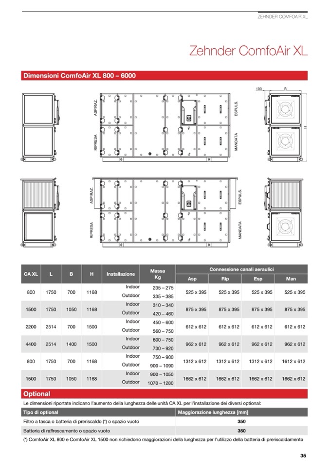 Le dimensioni riportate indicano l’aumento della lunghezza delle unità CA XL per l’installazione dei diversi optional: