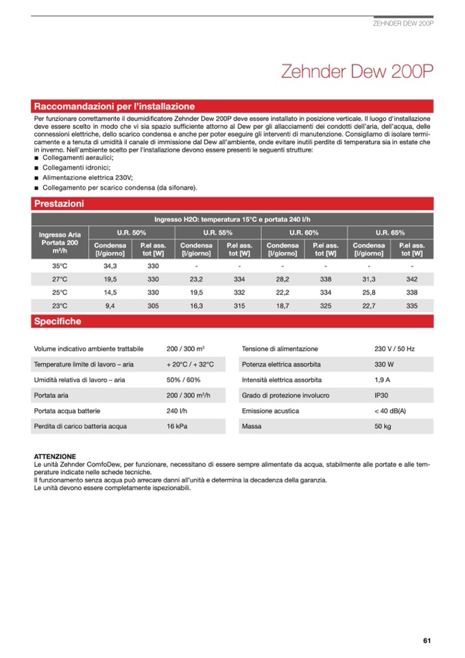 Per funzionare correttamente il deumidificatore Zehnder Dew 200P deve essere installato in posizione verticale. Il luogo d'installazione