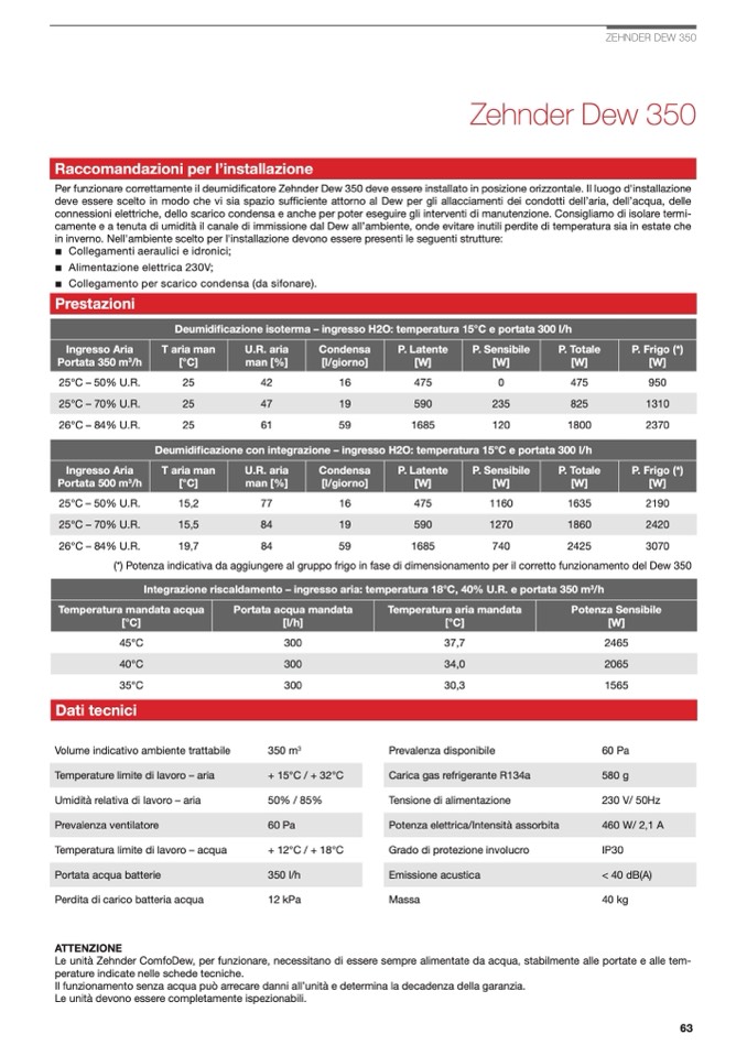(*) Potenza indicativa da aggiungere al gruppo frigo in fase di dimensionamento per il corretto funzionamento del Dew 350
