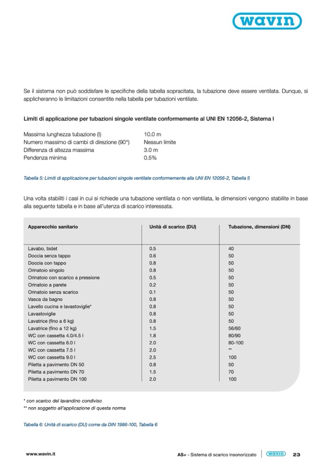 Tabella 5: Limiti di applicazione per tubazioni singole ventilate conformemente alla UNI EN 12056-2, Tabella 5