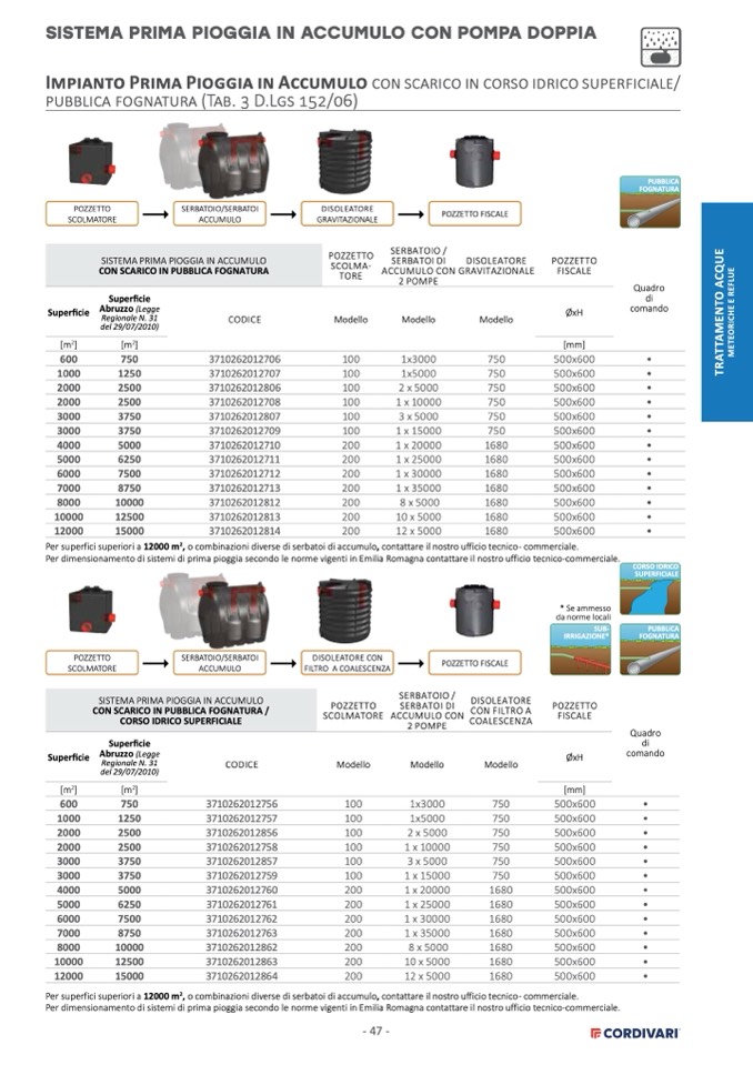 Per dimensionamento di sistemi di prima pioggia secondo le norme vigenti in Emilia Romagna contattare il nostro ufficio tecnico-commerciale.