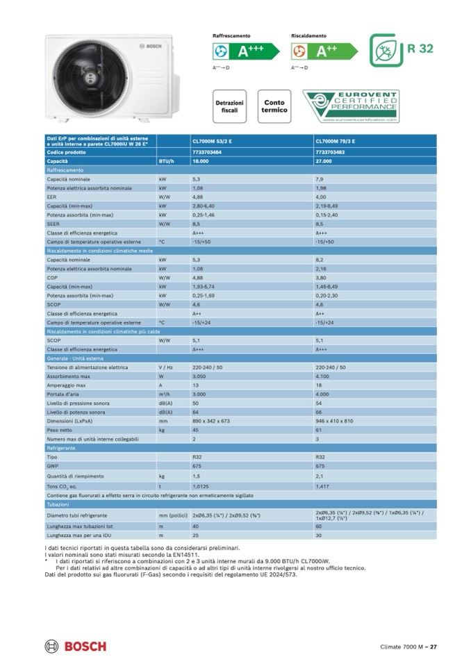 * I dati riportati si riferiscono a combinazioni con 2 e 3 unità interne murali da 9.000 BTU/h CL7000iW.