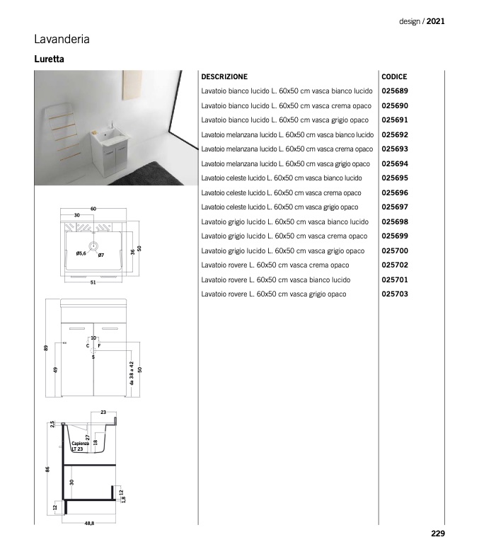 Lavatoio bianco lucido L. 60x50 cm vasca crema opaco