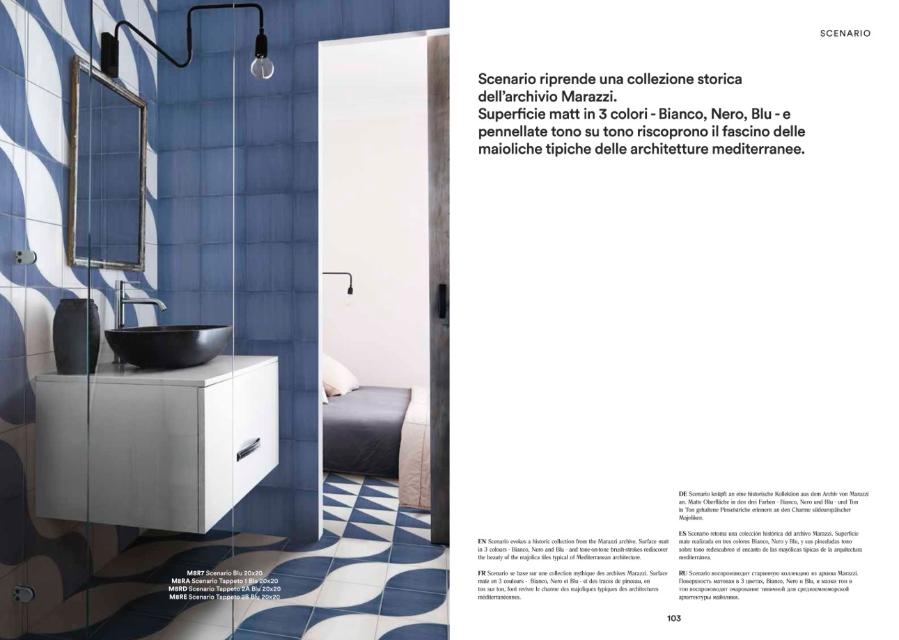 EN Scenario evokes a historic collection from the Marazzi archive. Surface matt